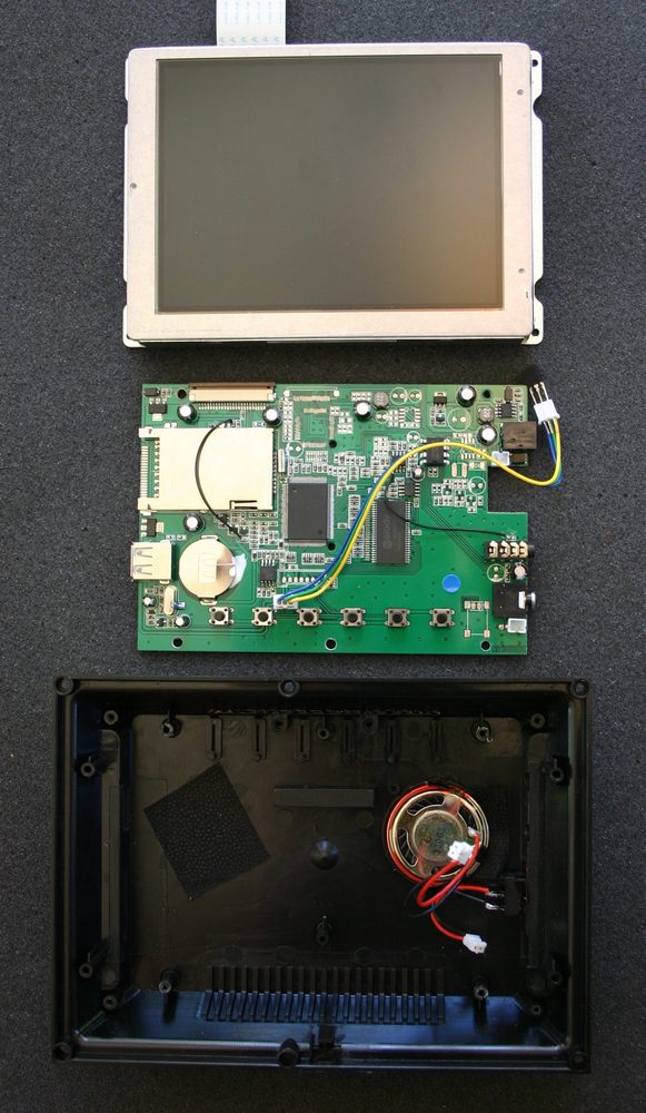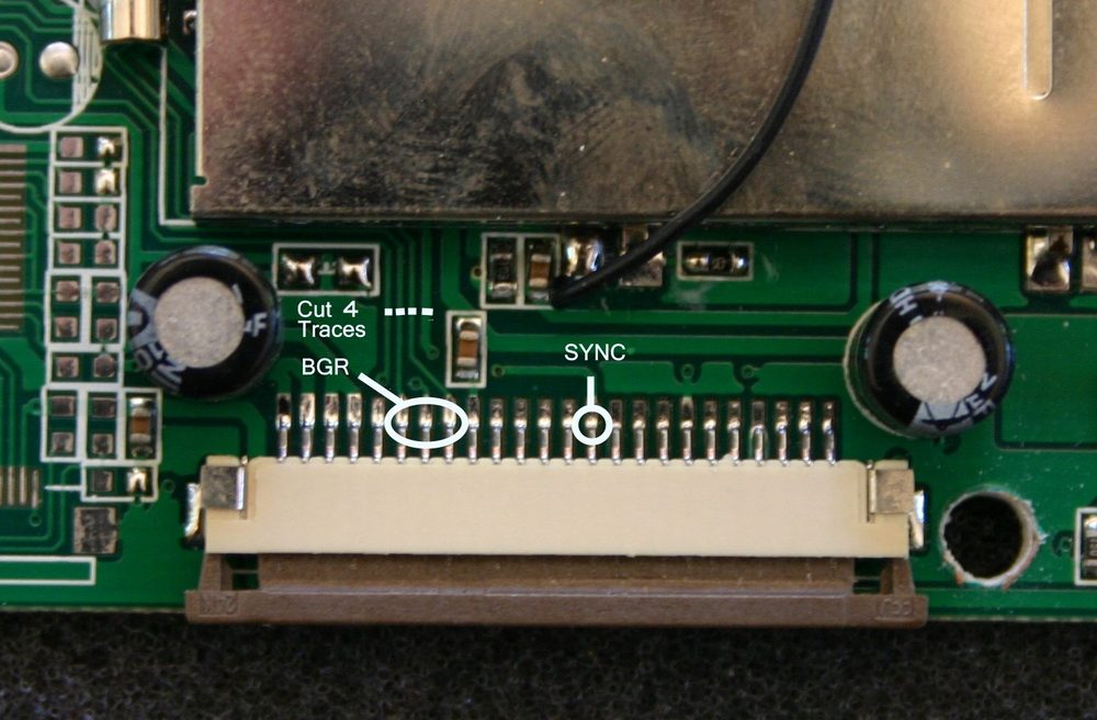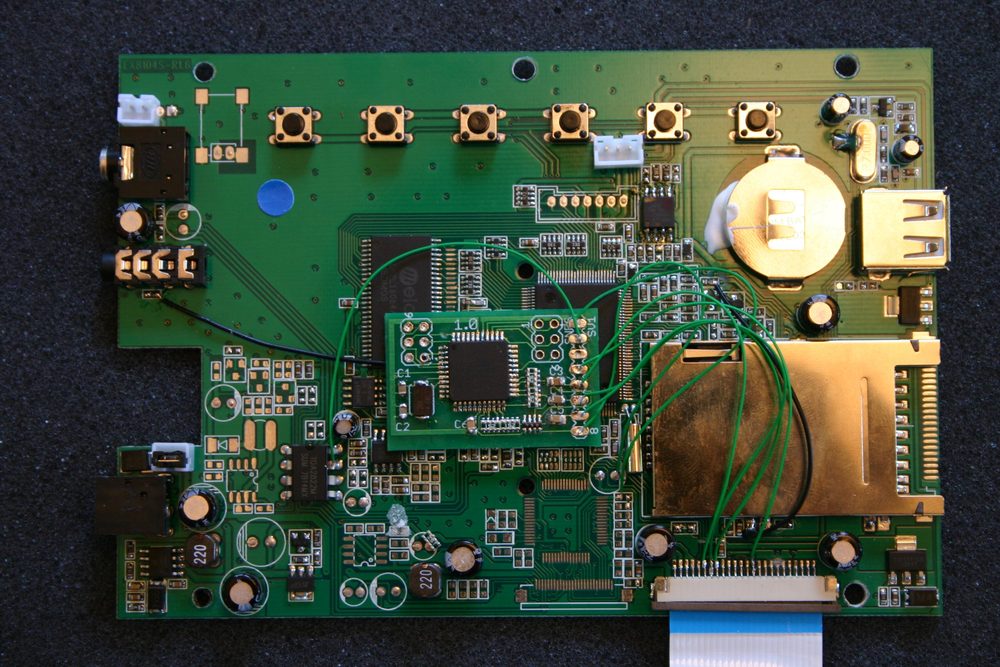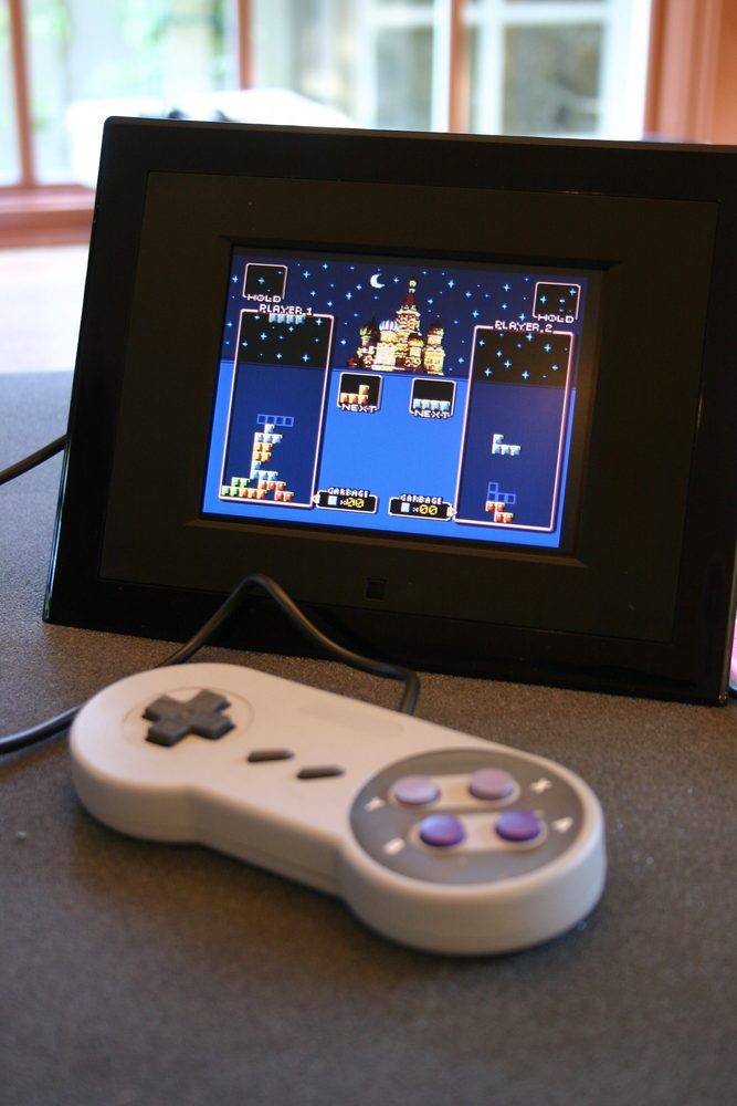 iv) I hate soldering 805 resistors I needed to cut 4 traces (RGB and SYNC) on the board near the lcd’s FPC connector (note that this is a zif socket, pull out the dark brown bit rather than yanking on the cable) to get the video signal into the lcd. There are 7 attach points – VCC,GND, Audio to the TDA2882 amp, RGB and SYNC. I drilled a hole in the case between and inserted a SNES controller cable, knotted it for strain relief and soldered the 5 wires (VCC,GND, CLK, Latch and Data) to the parasite. Double sided tape holds the beasty in place. Close case, enjoy. $20 for the photo frame, $7 for the ATMega644p, $2 for crystal, caps and resistors, $3 for the controller, $1 for the homebrew board.
